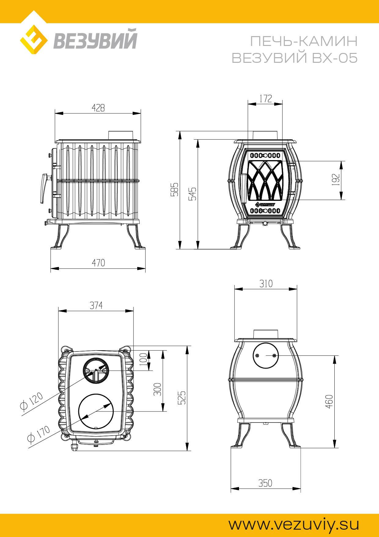 Печь-камин Везувий ВХ-05 "Антрацит" изготовлена из качественного жаростойкого чугуна с толщиной стенок 6-8 мм. Модель рассчитана на обогрев помещений объёмом до 100 м³. Печь-камин имеет пламегаситель изготовлен из чугуна. В Топки печи-камина установлена система двухуровневого вторичного дожига. С помощью этой функции по специальному каналу поступает воздух, который нагревается при прохождении между топочной камерой и задней стенкой корпуса. Далее нагретый воздух через дефлектор поступает в топку, перемешивается с газами - продуктами горения, чем вызывает повторное возгорание. Регулировка этой системы, осуществляется заслонкой, расположенной в нижней части печи-камина. Регулировка подачи воздуха в колосниковую зону осуществляется заслонкой, расположенной в нижней части двери. В верхней части двери расположена ручка регулировки системы чистое стекло, которая помогает оставаться стеклу чистым. Патрубок дымохода Ø 120 мм – универсальный, со сменным положением.